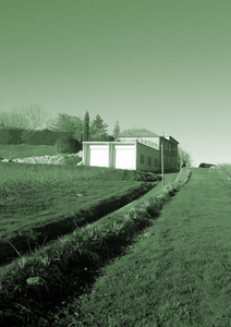 Constituée de deux volumes en surélévation, cette construction est perchée sur des hangars agricoles et présente une mitoyenneté sur l’arrière de son implantation. Un premier volume abritant les espaces de jour, dont la toiture est à quatre pans, s’ouvre à l’Est et au Sud sur le paysage des collines. Le second volume surmonté d’une toiture plate abrite, au Nord-Ouest, les espaces de nuit.